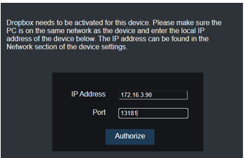 - Once you authenticate with Dropbox, it will take you to the below Dropbox page, where you type in the Concord DVR’s local IP address and web port (80 is the default), and then click Authorize (The Concord and the PC / Laptop must be on the same network for this to work).