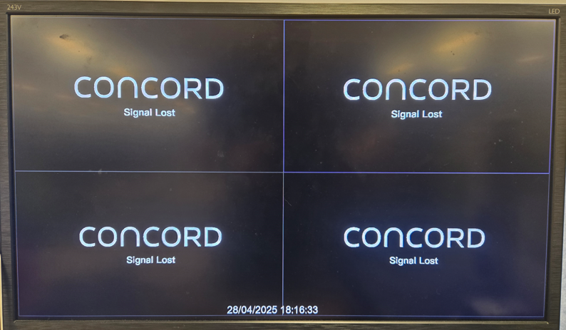 Symptoms of this issue: The cameras displayed on the screen connected to a Concord DVR (Model name CDKxxxx-x) all say "Signal Lost" as shown below.